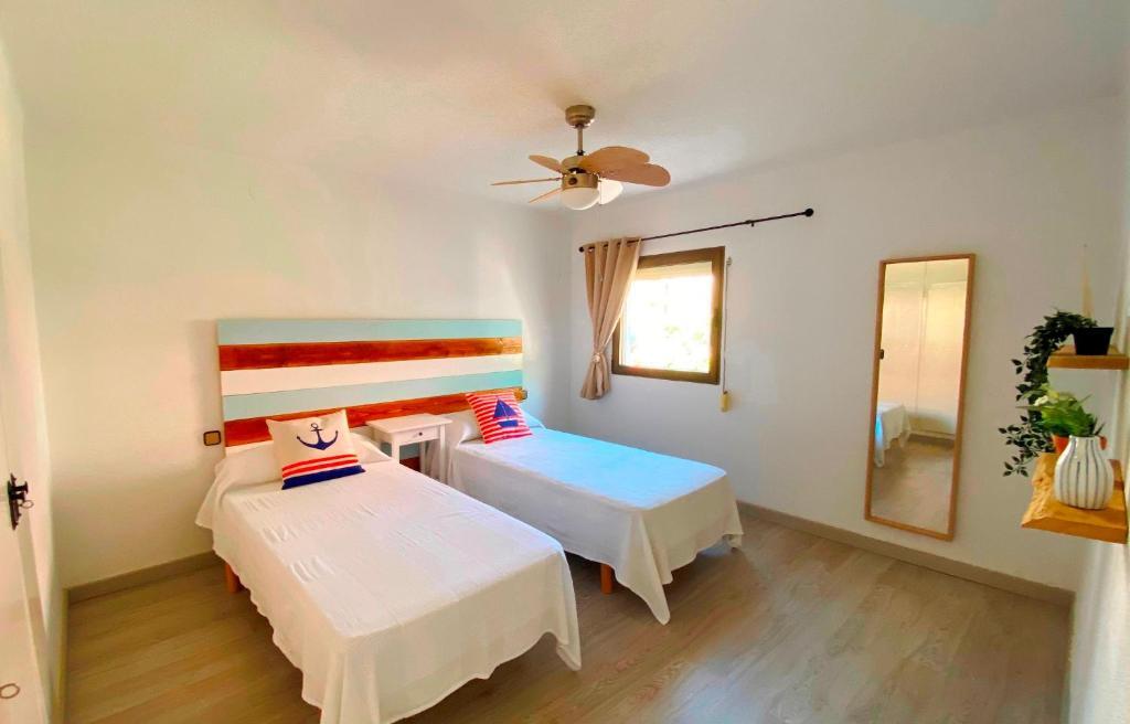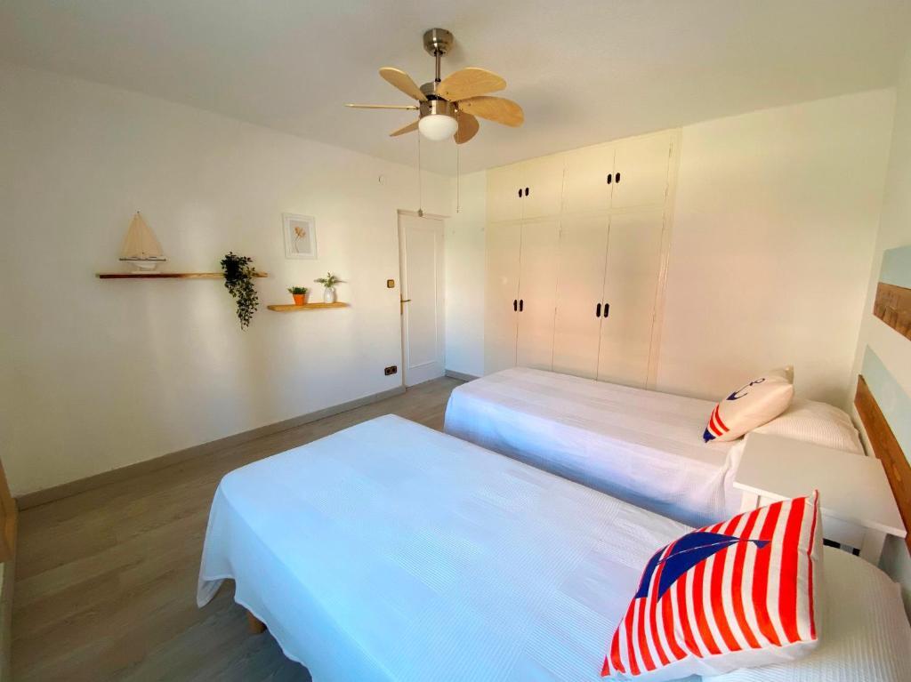 Habitación doble con kitchenette, decorada en tonos claros y ventilador de techo.
