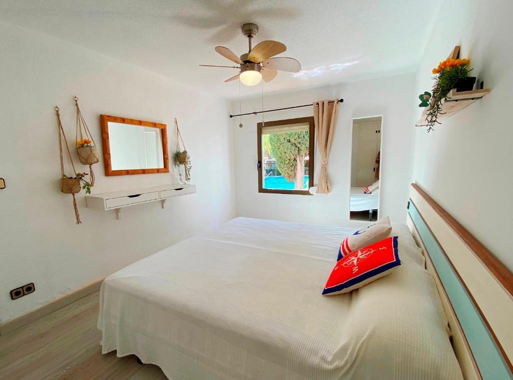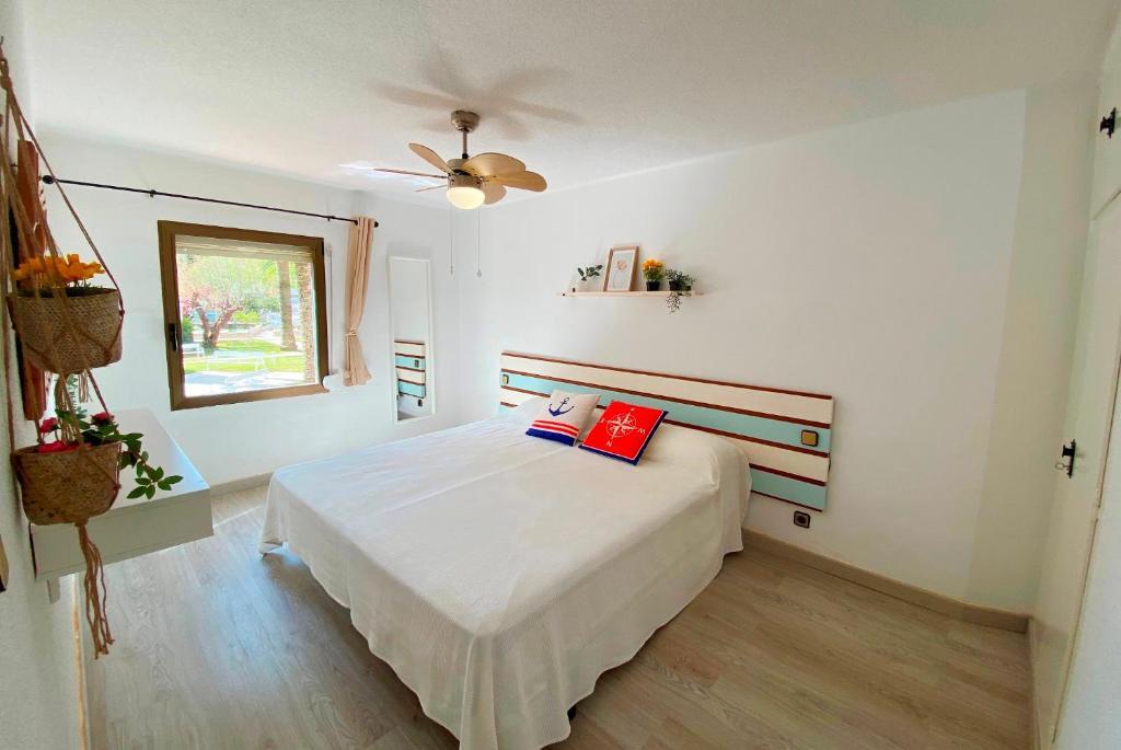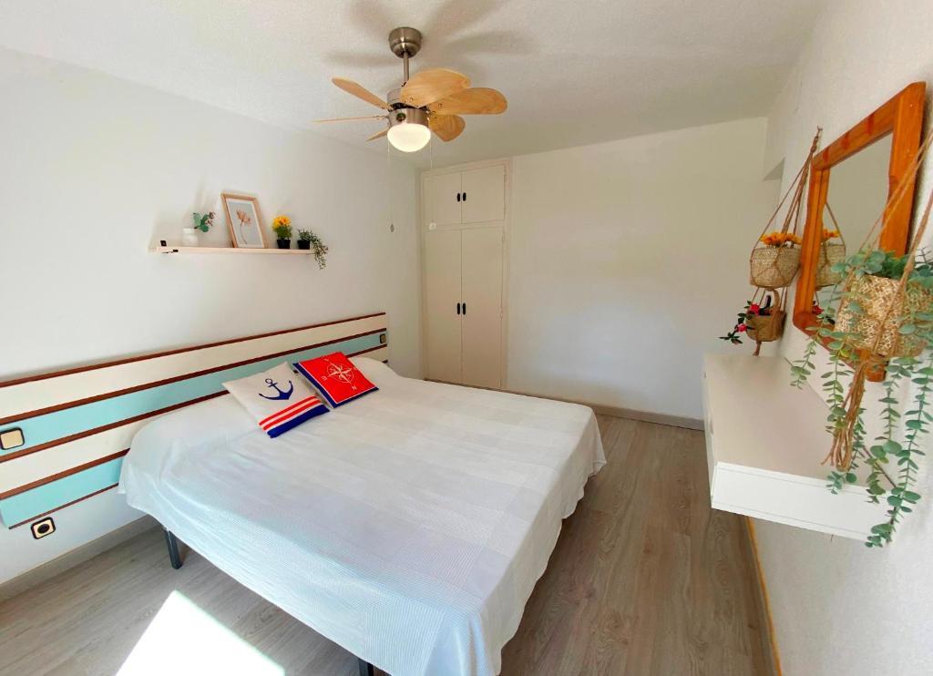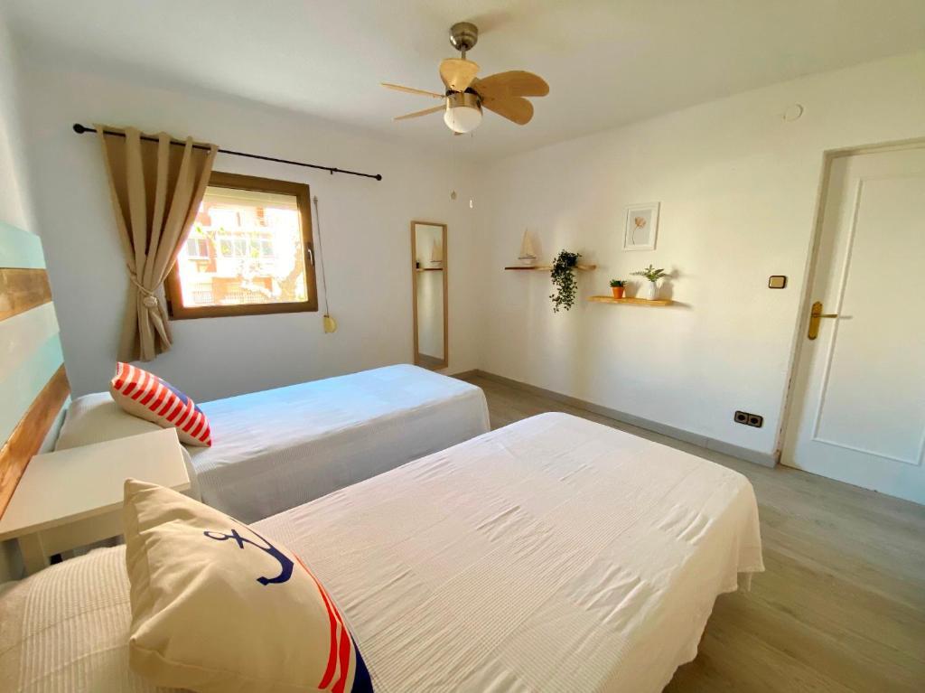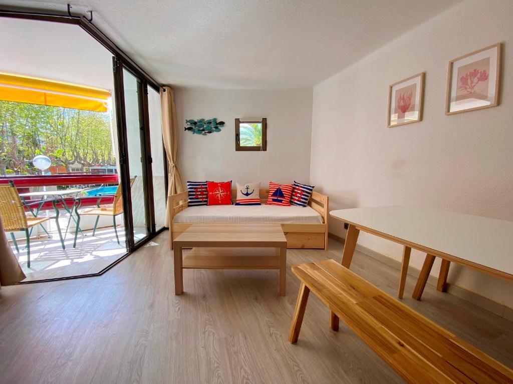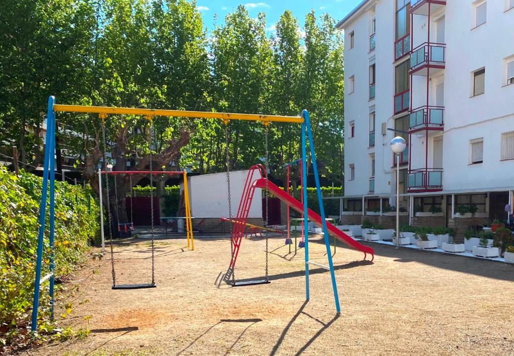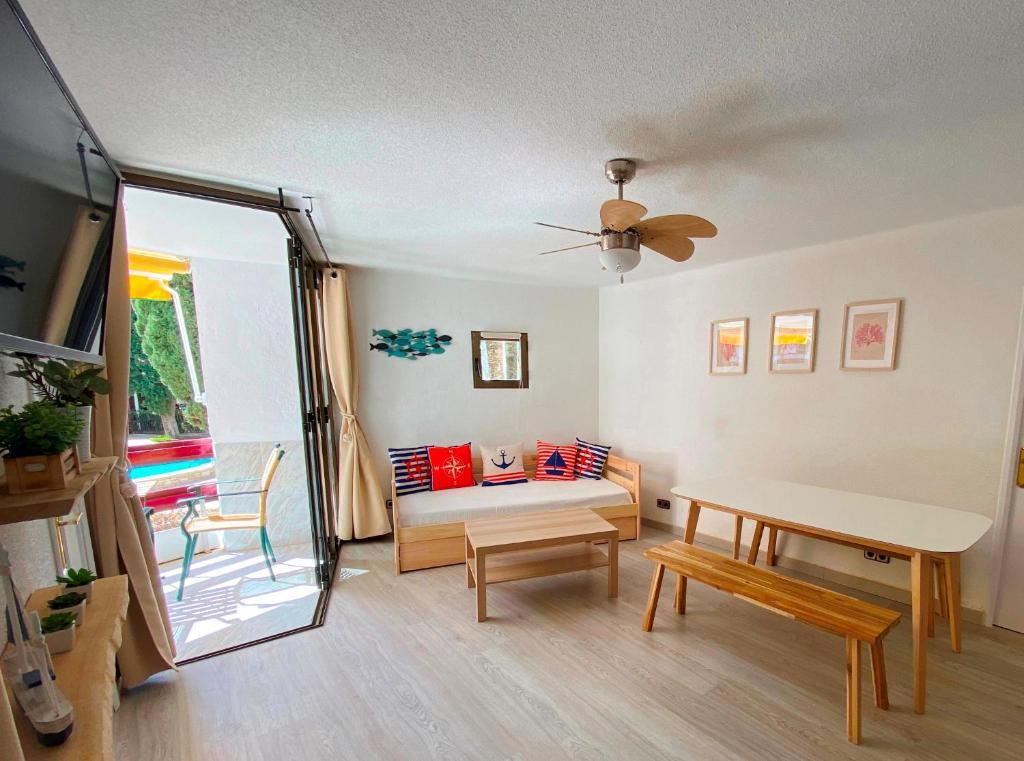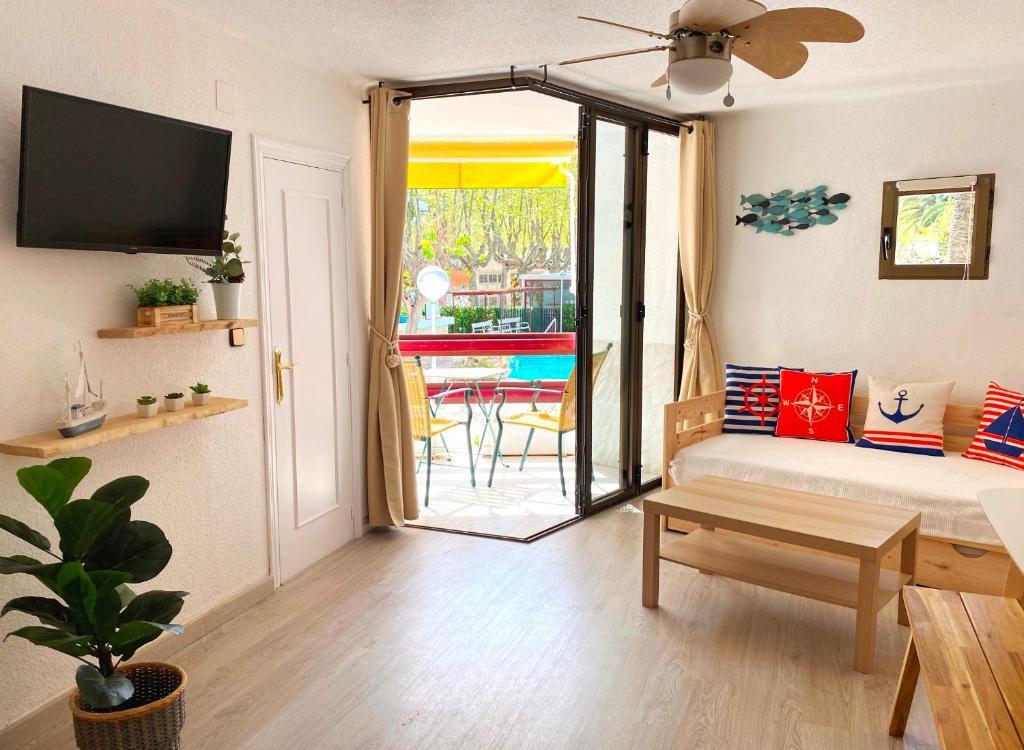 Apartamento 2 dormitorios (4/6 personas): Un dormitorio con 1 cama matrimonial o 2 camas individuales y otro con dos camas individuales, sala de estar con sofá cama, baño con ducha o bañera, cocina y terraza amueblada con vistas al jardín y piscina. Ubicados en una zona céntrica y tranquila, se encuentran a unos minutos de la playa y el paseo marítimo. Rodeado de supermercados y restaurantes, con piscina comunitaria, jardín y parque infantil, los apartamentos Corcega son ideales para familias. A 10 minutos en coche de Port Aventura. Aire acondicionado, ventiladores,TV, wifi, ropa de cama y toallas incluidas. Sin ascensor