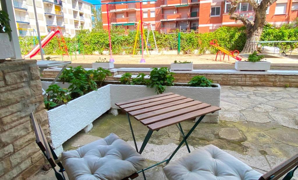 Córcega Estudio familiar: 35m2 dispone de sala con sofá nido, separación con 2 camas individuales, zona de cocina, baño y terraza. Ubicados en una zona céntrica y tranquila, se encuentran a unos minutos de la playa y el paseo marítimo. Rodeado de supermercados y restaurantes, con piscina comunitaria, jardín y parque infantil, los apartamentos Corcega son ideales para familias. A 10 minutos en coche de Port Aventura. Aire acondicionado, ventiladores,TV, wifi, ropa de cama y toallas incluidas. Sin ascensor.